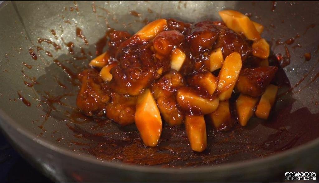 8、加入勾芡芡汁,炒至粘稠,呈现拉丝状就可以了。
