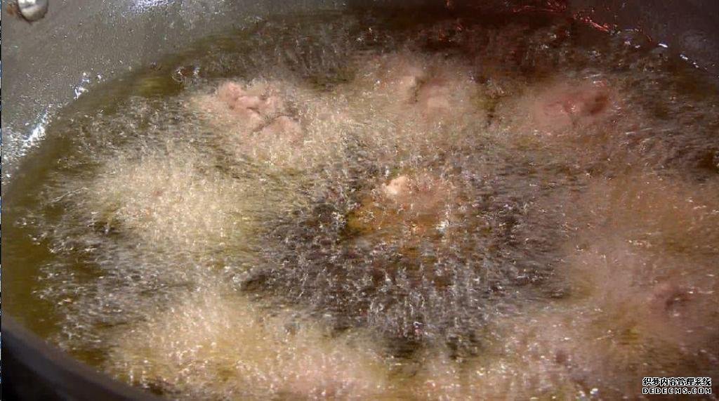 4、荔枝肉下进油锅进行第一次炸制。