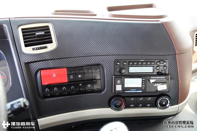 整个中控台采用了拼色处理,是江淮最新的中控设计,副驾一侧为黄棕色,而驾驶位一侧是仿炭纤维风格,在这块炭纤维面板上布置着一些功能按键,亮点是居然有定速巡航功能,这一功能的应用,大大缓解了驾驶员的劳动强度。