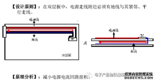 在考虑安全条件下,电源线应尽可能靠近地线,以减小差模辐射的环面积,也有助于减小电路的交扰。