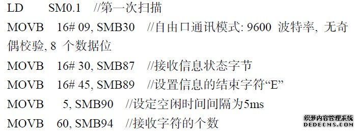PLC 的CPU 处于STOP 模式时,自由口通讯被禁止, 只有当CPU 处于RUN 模式时, 才可使用自由口通讯.SMB30(这里选择端口0)是自由口模式控制字节, 用来设定校验方式、通讯协议、波特率等通讯参数.发送指令XMT 启动自由端口模式下数据缓冲区中的数据发送, 它可以方便地发送1~255 个字符,如果有中断程序连接到发送结束事件上, 在发送完成后, 端口0 会产生中断事件9, 也可以监视发送完成状态位SM45 的变化.接收指令RCV 可以初始化接收信息服务, 通过指定的通讯端口接收信息并存储在数据缓冲区内.在接收完最后一个字符时, 端口0 产生中断事件23. PLC 初始化程序如下: