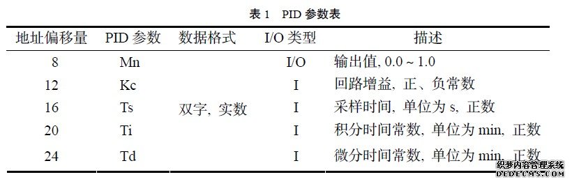 PID 指令根据表格(TBL)中的输入和配置信息对引用LOOP执行PID 循环计算。在执行PID 指令前, 要建立一个参数表, 一般要对表1 中的参数进行初始化处理。