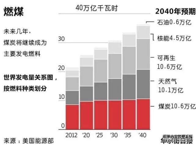 尽管天然气和可再生能源正在削弱着煤炭发电的在全球发电量市场上的领先地位,美国能源信息管理局(EIA)今年春天表示,2040年全球燃煤发电量有望比2012年提高23%。EIA表示,尽管美国和欧洲的煤炭使用量有所下降,仅印度和中国新建的发电厂就贡献了燃煤发电增长量的三分之二。