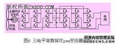 随着风电机组单机容量的不断增大,风电变流器的电压与电流等级也在不断提高,因此多电平变流器拓扑得到了广泛关注。变流器采用多电平方式后,可以在常规功率器件耐压基础上,实现高电压等级,获得更多级(台阶)的输出电压,使波形更接近正弦,谐波含量少,电压变化率小,并获得更大的输出容量。图6是直驱风电系统中三电平背靠背双pwm变流器拓扑,与两电平双pwm变流器相比,功率器件和电容增加了一倍,并额外增加了箝位二极管;直流侧电容由两个完全一样的电容串联组成,电容的中点作为变换器的箝位点,由网侧变换器保持直流侧两个电容的电压均衡。这种结构在风电中的应用目前已经比较成熟,对其的研究很多,主要集中在控制策略的优化上[8]。目前,世界范围内从事大功率风力发电用变流器和高压变频器研制的一些公司,都有多电平的产品方案;abb用于风力发电的变流器如acs1000,整流器采用12脉冲二极管整流,逆变器采用三电平npc结构,器件采用igct;siemens也有相似的应用,功率器件采用高压igbt;法国alstom公司采用飞跨电容型四电平拓扑,功率器件采用igbt,另外还基于igct开发出了飞跨电容型五电平变频器。