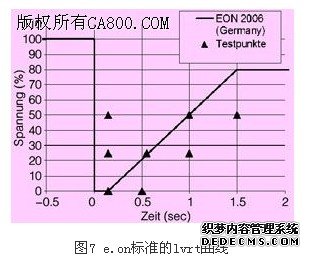 图7给出了德国e.on标准规定的低电压穿越曲线,其中电网电压跌落至0,持续时间为150ms左右,当电网电压在曲线以上时,风电机组要保持并网,并能够在电压跌落及恢复阶段向电网提供无功功率,帮助电网电压恢复稳定,只有当电网电压低于规定曲线以后才允许风电机组脱网。这就要求风电系统必须具有较强的低电压穿越能力,能快速向电网提供无功支持。