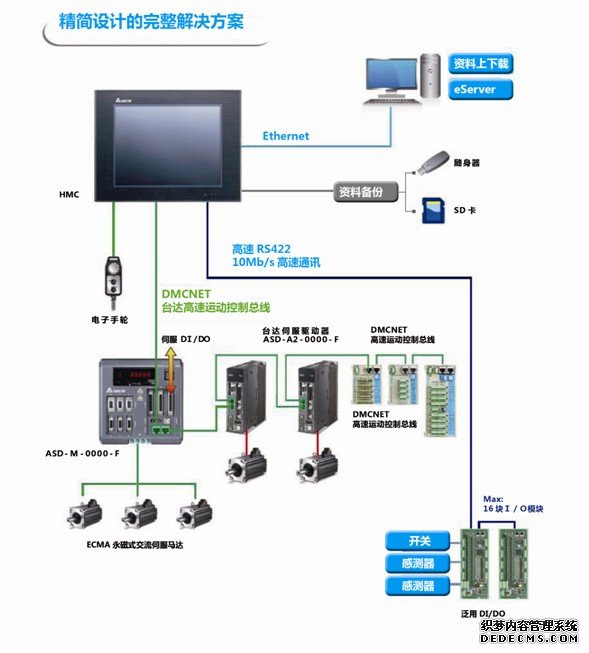2、HMC系列具备高速的DMCNET总线,搭配全新的ASD-M-F三轴驱动器,功能再升级。HMC执行机台逻辑控制以及信息显示,ASD-M-F则拥有强大的三轴运动功能如龙门同动、直线插补、圆弧插补等。并针对机台设备的I/O需求,提供10M高速全双工RemoteIO,支持32in/32out,最多可以扩充到16块RemoteIO。