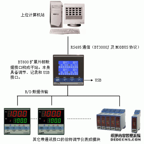 BT800全系列记录仪允许通过扩展的数据接口,对同一设备(或车间)内的其它伯特智能产品的数据和报警状态进行同步记录和管理,直接在BT800上对其它仪表参数进行修改。由于采用数据传送,消除了传统mA变送记录方式产生的模拟量误差。这一功能使BT800全系列仪表具备了通讯数据子站的能力。