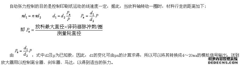 由,式中d2及p为已知数,因此,d1的变化可由pn的计算求得,所以可以将其转换成4~20ma的模拟信号输出,送到放大器用以控制离合器、刹车器、马达,以得到适当的张力。