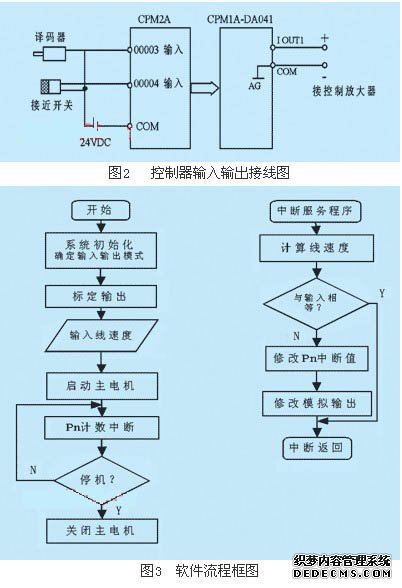 根据以上原理,选用欧姆龙cpm2a-60可编程序控制器和模拟量输出扩展单元cpm1a-da041作为中心控制单元,采用译码器检测测量轮的转速,采用接近开关检测放料卷的转速,通过计算利用cpm1a-da041输出模拟信号以控制离合器达到恒线速的目的。其控制接线如图2所示: