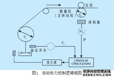 转移印花机的印刷质量,完全取决于放卷和收卷的张力控制,该机器在改造前采用的是手动张力控制,成品率较低,其产品质量完全取决于工人的熟练程度,所以,在整机的plc控制改造过程中,也对张力控制部分一并改造,为了减少改造费用,选用了欧姆龙cpm2a-60cdr-d型可编程序控制器和cpm1a-da041模拟量输出模块构成控制系统。其张力控制逻辑框图如图1所示。