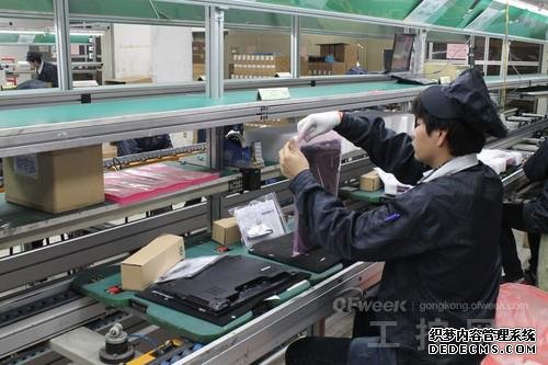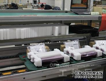 一台完整的可以出货的笔记本就要诞生了,员工将笔记本放进塑料口袋里,封好封条,放进缓冲泡沫塑料中,再将电源适配器装到指定的盒子里,取出的电池也有单独存放的空间,递送到装箱部门,再由其装箱,贴上封条,这样一台完整的待出货笔记本就已经正式下线了。