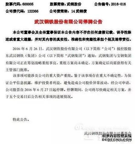 今日,武钢和宝钢宣布战略重组