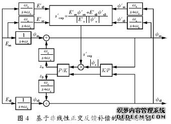 文献[12]对永磁同步电机直接转矩控制中磁链观测这一关键技术进行了研究,设计了一种新型磁链观测器非线性正交反馈补偿磁链观测器。磁链观测是直接转矩控制技术中关键部分,直接关系到电机的运行性能和直接转矩控制方案效果,适合永磁同步电机直接转矩控制应用的新型非线性正交反馈补偿磁链观测器算法可以用式(1)表示。