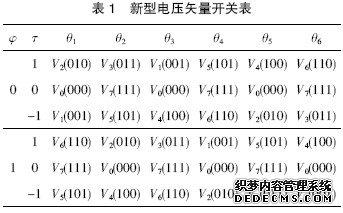 直接转矩控制技术是继矢量控制后发展起来的,最早应用在感应电机中,随后应用到永磁同步电动机控制系统中。永磁同步电动机不能像异步电机那样用零电压矢量降低转矩,而采用反向电压减小转矩,这样会产生较大的转矩波动。文献[2]分析了零电压矢量在异步电机和同步电机中的不同作用,构造了一种应用零电压矢量来减小转矩的新型电压矢量开关表,如表1 所列,可以改善转矩脉动和系统性能。文献[11]也构造了一种新型的含零电压矢量的控制开关表,改变了传统的控制系统。并通过仿真结果表明,正确地使用零电压矢量能够有效减少转矩脉动,改善系统性能。直接转矩控制的系统能以较大的转矩启动,并且含零电压矢量的系统的转矩平稳性较好,转矩波动比较小,并且在扰动后能在较短的时间内恢复稳定。