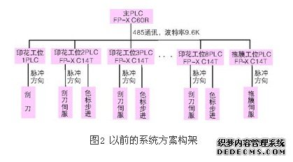 图2为以前的系统方案构架,整套系统中plc之间采用485的通讯方式,主站plc通过485来协调下面各个工位plc之间的动作并交换各种数据,交换的数据包括报警信息、印制长度等,整套系统中所使用的plc根据工位的增加而增加。