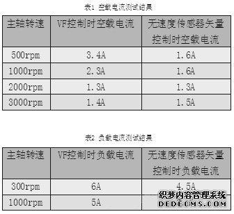 从表1和表2可以看出在恒转矩输出的频率段(0-50Hz),矢量控制的空载电流几乎只有VF控制的一半,负载时电流也比VF小一些;而且负载切削时,VF控制在初期有很明显的速度下降,而且空载速度和负载速度有比较大的差值。而相对于矢量控制,主轴转速初期虽然也会有下降,但是下降值较小,并且速度会很快回升,最终空载速度和负载速度相差不是很明显。经过上面的调试,与VF控制比较,性能有了很大的改善,无论从空载电流,低速力矩,还是速度的变化,效果都是非常明显的,完全能够满足数控机床的需求。投入运行后,使用效果令人满意,说明台达M系列变频器在车床主轴控制系统中的应用是成功的。