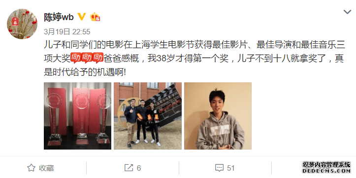 张艺谋的妻子陈婷高兴地发微博感叹:“儿子和同学们的电影在上海学生电影节获得最佳影片、最佳导演和最佳音乐三项大奖。爸爸感概,我38岁才得第一个奖,儿子不到十八就拿奖了,真是时代给予的机遇啊! ????”