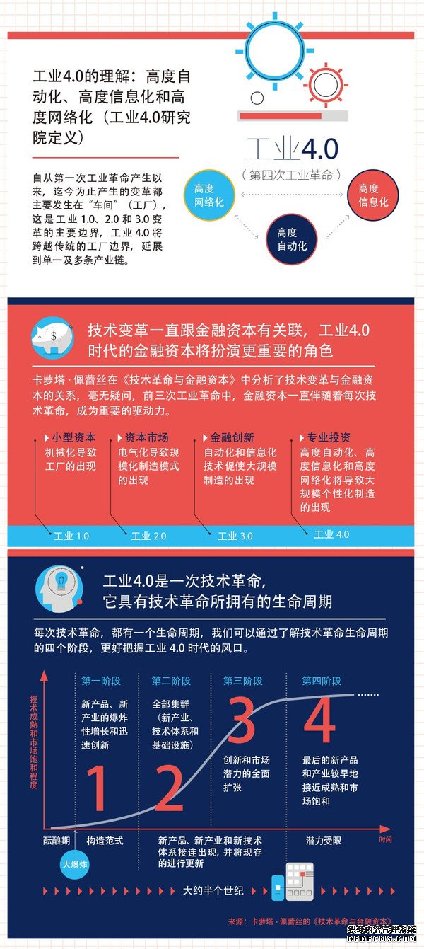 在工业1.0时期,机械化导致工厂出现,小型资本参与其中,到了工业2.0时代,电气化导致规模化制造模式出现,现代资本市场形成。工业3.0时代,自动化和信息化技术促使大规模制造的出现,这时候就需要金融创新,而在工业4.0时代,高度自动化、高度信息化和高度网络化将导致大规模个性化制造的出现,专业投资变得更加重要。