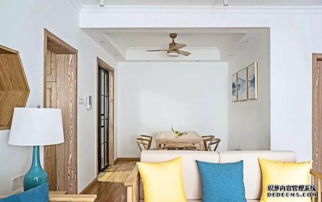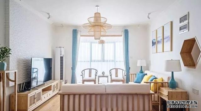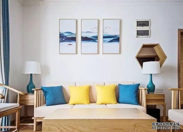 ▲ 中式风中较为典型的元素就是圈椅,这里采用圈椅+罗汉床榻,选购几个青蓝色+鹅黄色的抱枕,使得空间富有文华底蕴却不老成的感觉。