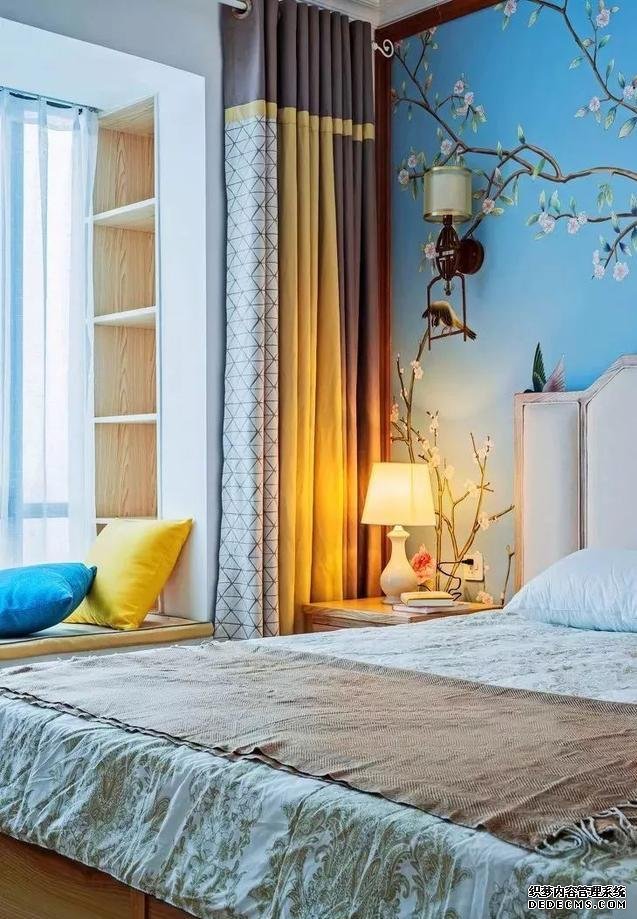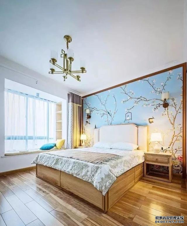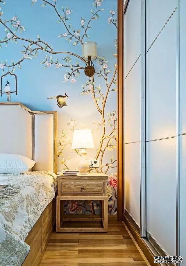 ▲ 特殊性的壁纸配上典型的中式木质家具,结合软包的主卧床头背景,体现活泼的禅意氛围。
