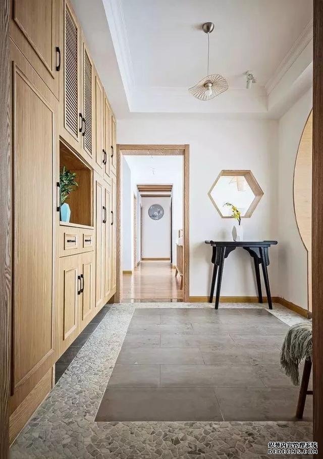 ▲ 这是由原本的入户花园改成的玄关区,把之前原本不完全属于室内的空间纳入到室内的面积,地面的铺装非常有特色,采用鹅卵石瓷砖+青石砖的形式,方便打理同时又有一些户外庭院的感觉。