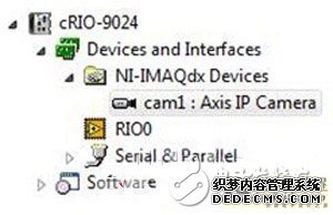 在MAX中的CompactRIO下,打开设备和接口菜单,然后打开NI-IMAQdx设备,您就能看到叫做camX的IP摄像头,其中的X是驱动分配给您摄像头的值。