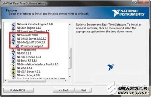 一旦您检测到主机PC具有正确的软件之后,您必须将软件安装到您的CompactRIO控制器,这样您才能从IP摄像头中得到图像。CompactRIO控制器应当出现在MAX中远程系统图标下。打开目标然后右击软件并选择增加/删除软件。这样就打开了labview实时软件向导。选择常用软件安装并单击下一步。选择同意来继续手动安装。软件必须的两个部分是NI 视觉 RT 9.0.0和IP摄像头支持。在NI-IMAQdx RT下找到IP摄像头支持。一旦您选择好安装这两个软件,单击下一步开始安装。