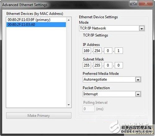 当您已经完成必要软件的安装并重启系统后,单击远程系统下的CompactRIO来打开网络设置。默认设置下,CompactRIO控制器的次级以太端口不是激活的,所以您必须设置您的IP摄像头使之能够通过网络通讯。要这样做,选择高级以太网设置。一旦设置窗口打开,单击以太网设备下的次级MAC通讯录,将模式切换到TCP/IP,并将IP地址设成169.254.0.x用于局域网连接,子网掩码设为255.255.0.0 。当这些设置与下面的屏幕截图相同时单击完成,然后被提示重启电脑时单击同意。